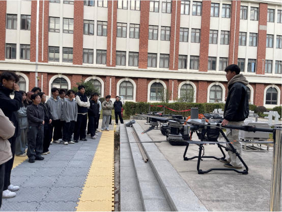 本次活动分为机型展示、科普讲解、飞行体验三个主要环节。活动伊始,工程师们现场展示了多款行业级无人机设备,介绍其设计特点与技术性能。随后的科普讲解中,技术专家结合行业经验,解读无人机基本构造、飞行原理及核心技术,介绍其在多领域的应用场景,并重点分享低空经济产业现状与前景,让学生深刻认识到该技术的产业价值。社团成员专注聆听、积极提问,互动氛围十分热烈。