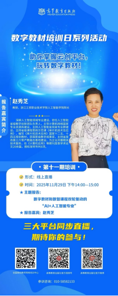 11月29日,在高等教育出版社主办的“数字教材培训日”系列活动中,浙江工贸职业技术学院人工智能学院院长赵秀芝教授受邀作线上专题分享。本期培训通过全国高校教师网络培训中心、高等教育出版社官方视频号及官方微博号三大平台同步直播,累计吸引来自32所高校(单位)的116名教师在线学习,视频号观看人数达466人,微博平台累计观看5557次,参与院校涵盖本科院校与高职院校,体现了本次专题分享在全国范围内的广泛关注度。