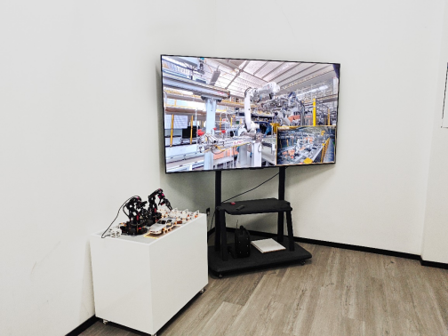 在数字孪生实践基地,六类数字孪生作品各具特色:数字孪生智慧工厂仿真平台以汽车玻璃安装模拟机械臂沙盘还原工业生产逻辑;