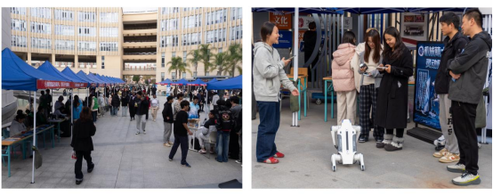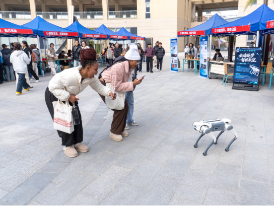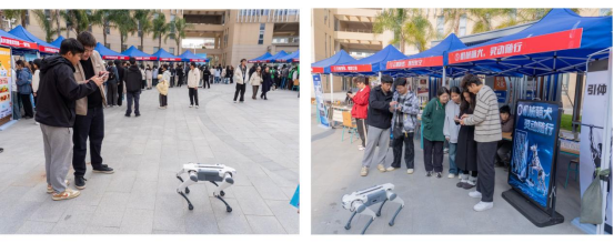 现场工作人员介绍道,这些机器狗搭载先进运动控制算法与传感器融合技术,是学院师生依托人工智能核心技术自主优化调试的成果,既彰显专业教学的实践成效,也让前沿科技变得可触可感。不少同学踊跃参与互动,在工作人员指导下通过遥控器下达指令,亲身解锁智能科技的独特魅力,沉浸式感受AI技术与实体应用结合的奇妙体验。